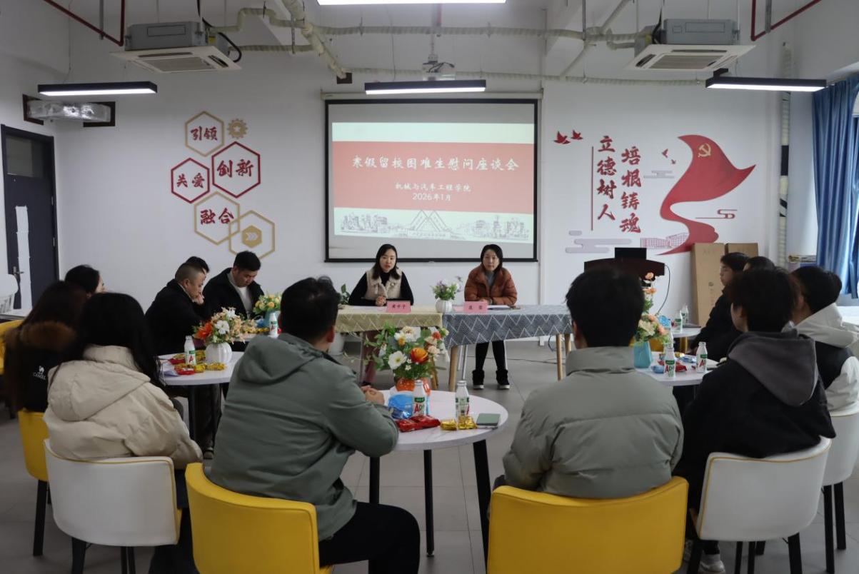 1月20日下午,机械与汽车工程学院在交通楼教工小家举行寒假留校困难生慰问座谈会。学院党委书记虞蓉、党委副书记黄中子、辅导员代表及学院寒假留校困难生代表等参加座谈交流,黄中子主持。