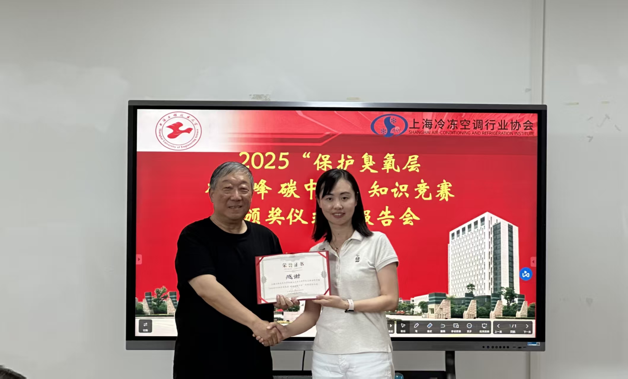 To promote environmental knowledge and spread the concept of ecological civilization, on September 16, the School of Mechanical and Automotive Engineering, under the guidance of the Shanghai Municipal Ecology and Environment Bureau’s Solid Waste and Chemicals Management Technology Center and in collaboration with the Shanghai Refrigeration and Air Conditioning Industry Association, hosted the award ceremony and report meeting for the 2025 “Ozone Layer Protection, Carbon Peaking and Carbon Neutrality” Knowledge Competition at the Transportation Building. Attendees included Lu Ronghua, Chief of the Solid Waste Center; Shao Naiyu and Gong Qingwei, Secretary-General and Deputy Secretary-General of the Refrigeration and Air Conditioning Industry Association; Shi Weihua, national training center instructor and WorldSkills Shanghai coach; Huang Zhongzi, Deputy Secretary of the School Party Committee; and faculty and student representatives including Deng Shengxiang and Xia Peng.